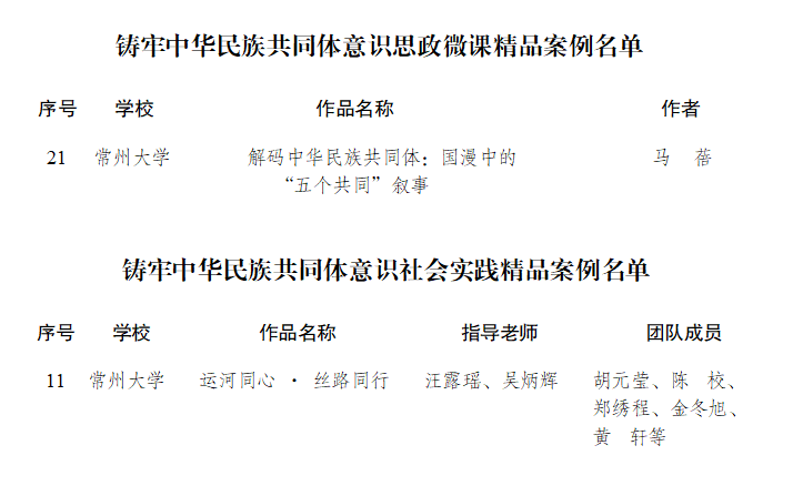 072026.01我校师生在省第三届“铸牢中华民族共同体意识·高校在行动”系列活动中喜获佳绩近日,省民宗委、省委宣传部、省委统战部、省教育厅公布了全省第三届“铸牢中华民族共同体意识·高校在行动”系列活动结果,常州大学师生在此次活动中喜获佳绩。在“闻·九州共贯”思政微课交流活动中,马克思主义学院教师马蓓老师的微课《解码中华民族共同体:国漫中的“五个共同”叙事》(全省仅40项)入选铸牢中华民族共同体意识思政微课精品案例。在“行·勠力同心”社会实践分享活动中,外国语学院报送的《运河同心·丝路同行——大运河文化带江苏段民族团结实践的“江苏样板”研究》(全省仅41项)(指导老师:汪露瑶、吴炳辉;团队成员:胡元莹、陈校、郑绣程、金冬旭、黄轩等)成果入选铸牢中华民族共同体意识社会实践精品案例。另外,美术与设计学院研究生范千里的作品留青竹刻《江南青果巷》入选“承·民族匠心”非遗作品校园展。活动开展以来,学校高度重视、积极筹划,动员师生广泛参与,推荐优秀师生代表参赛,充分展现了全校上下践行民族团结理念的积极性与行动力。下一步,常州大学将以此次活动为契机,深化铸牢中华民族共同体意识宣传教育,引导广大青年学生增进对伟大祖国、中华民族、中华文化、中国共产党、中国特色社会主义的高度认同,让休戚与共、荣